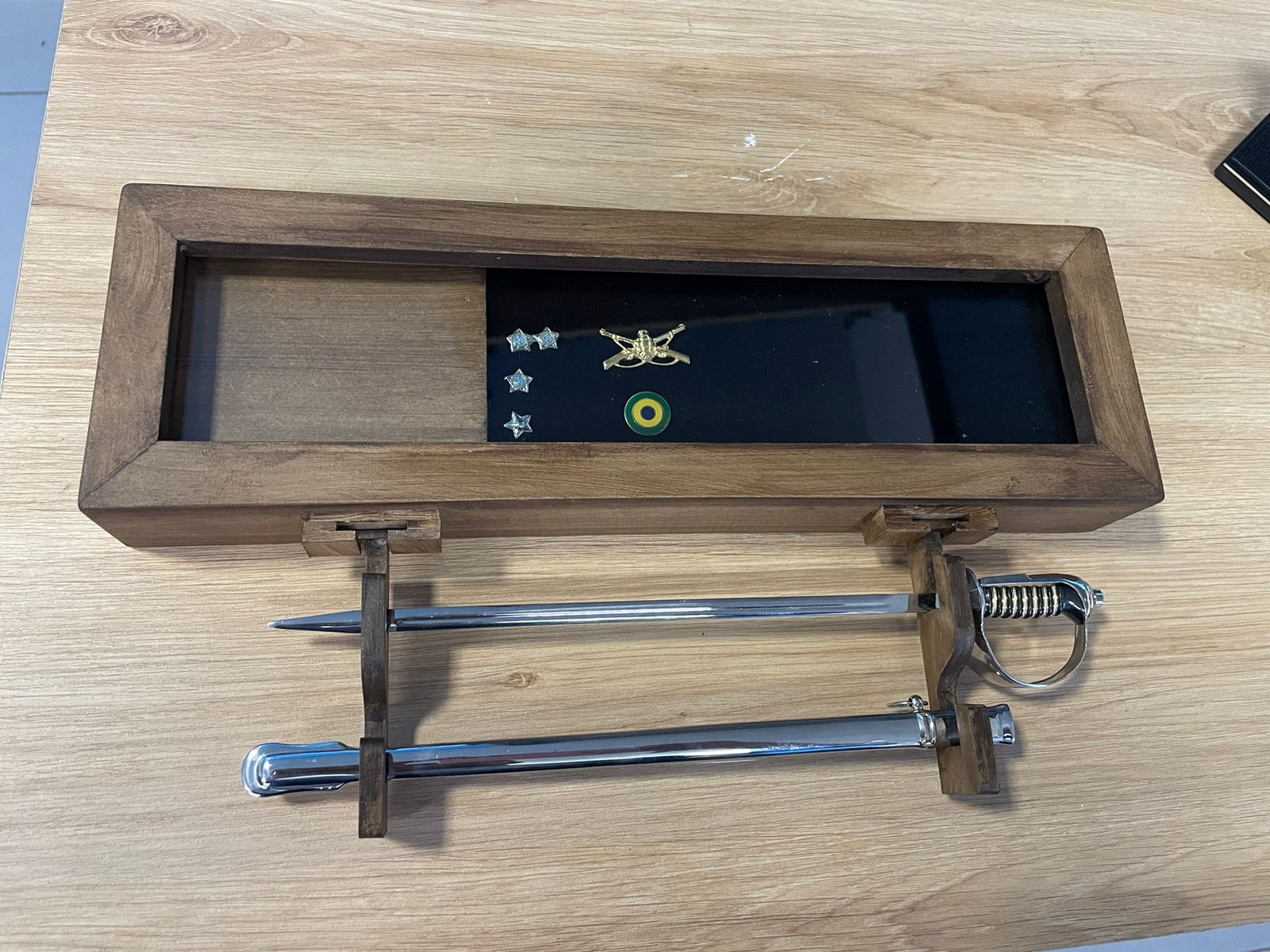 MOLDURA PORTA MEDALHAS, BREVES, DISTINTIVOS COM SUPORTE PARA MINI ESPADAS